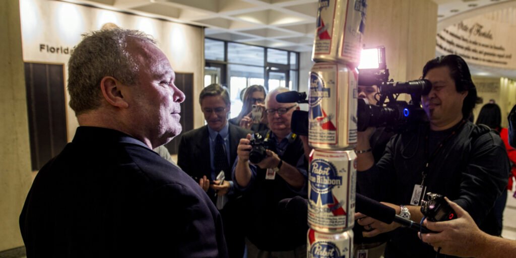 TALLAHASSEE, FL – DECEMBER 11: Chaz Stevens from Deerfield Beach, Florida talks to the media next to his Festivus pole made out of beer cans in the rotunda of the Florida Capitol December 11, 2013 in Tallahassee, Florida. Stevens display was intended to counter the religious Christian Nativity manger also on display. Based on an episode of the television sitcom Seinfeld, Festivus has become a secular holiday celebrated on December 23 to represent the antithesis of the commercialism of the Christmas season. (Photo by Mark Wallheiser/Getty Images)