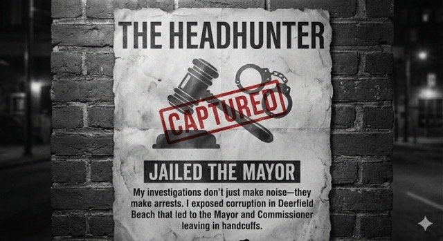 My early investigations didn't just make noise—they made arrests. I exposed corruption in Deerfield Beach that led to the Mayor and Commissioner leaving in handcuffs.