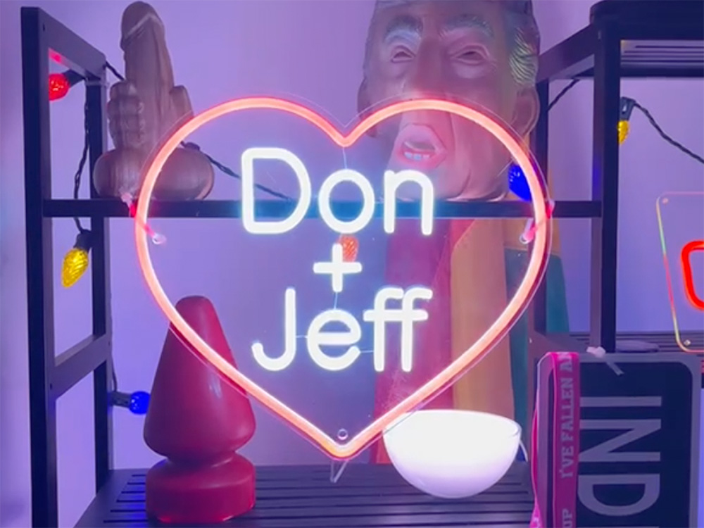 The topper is a neon heart—a callback to Valentine’s Day—paired with a message that does not attempt subtlety: