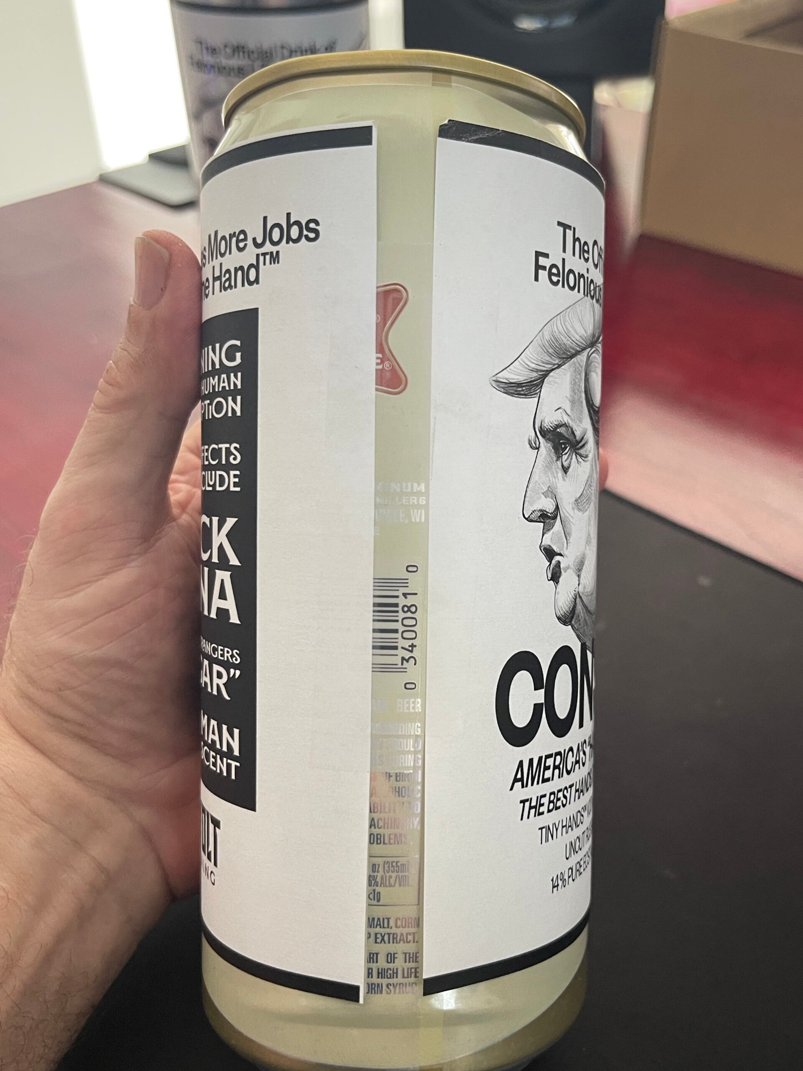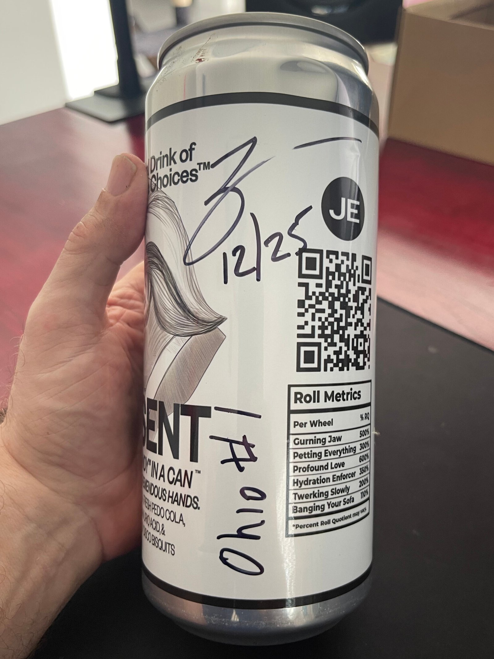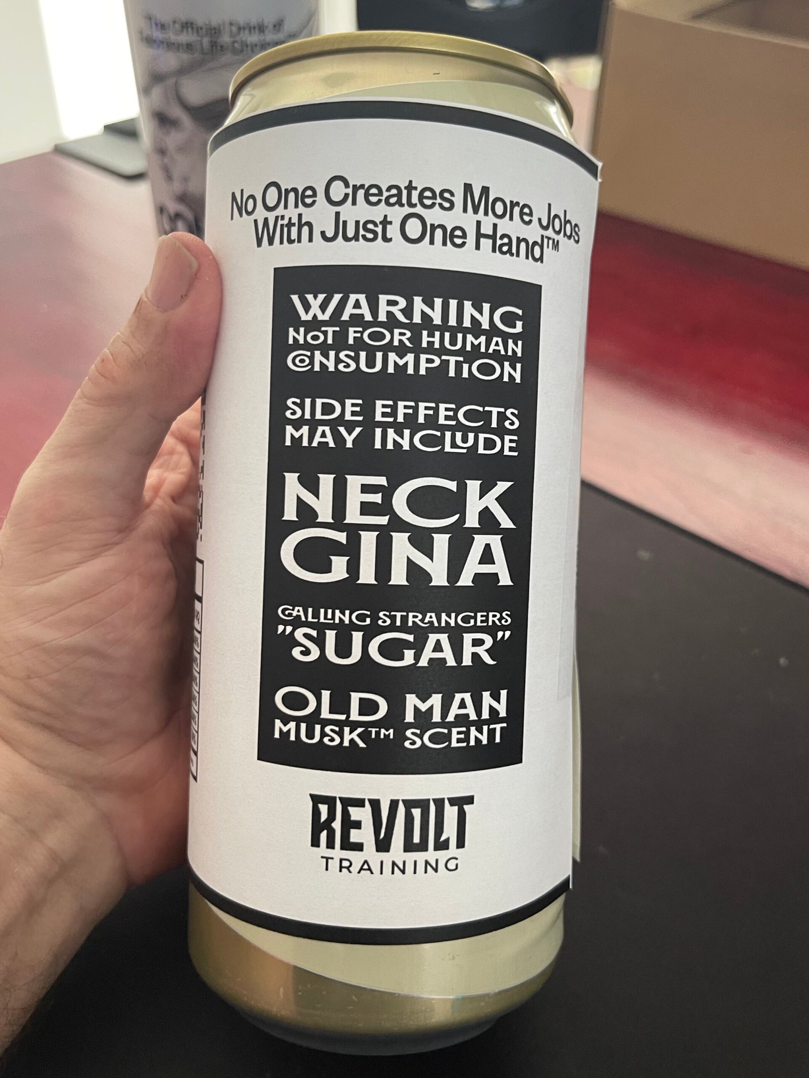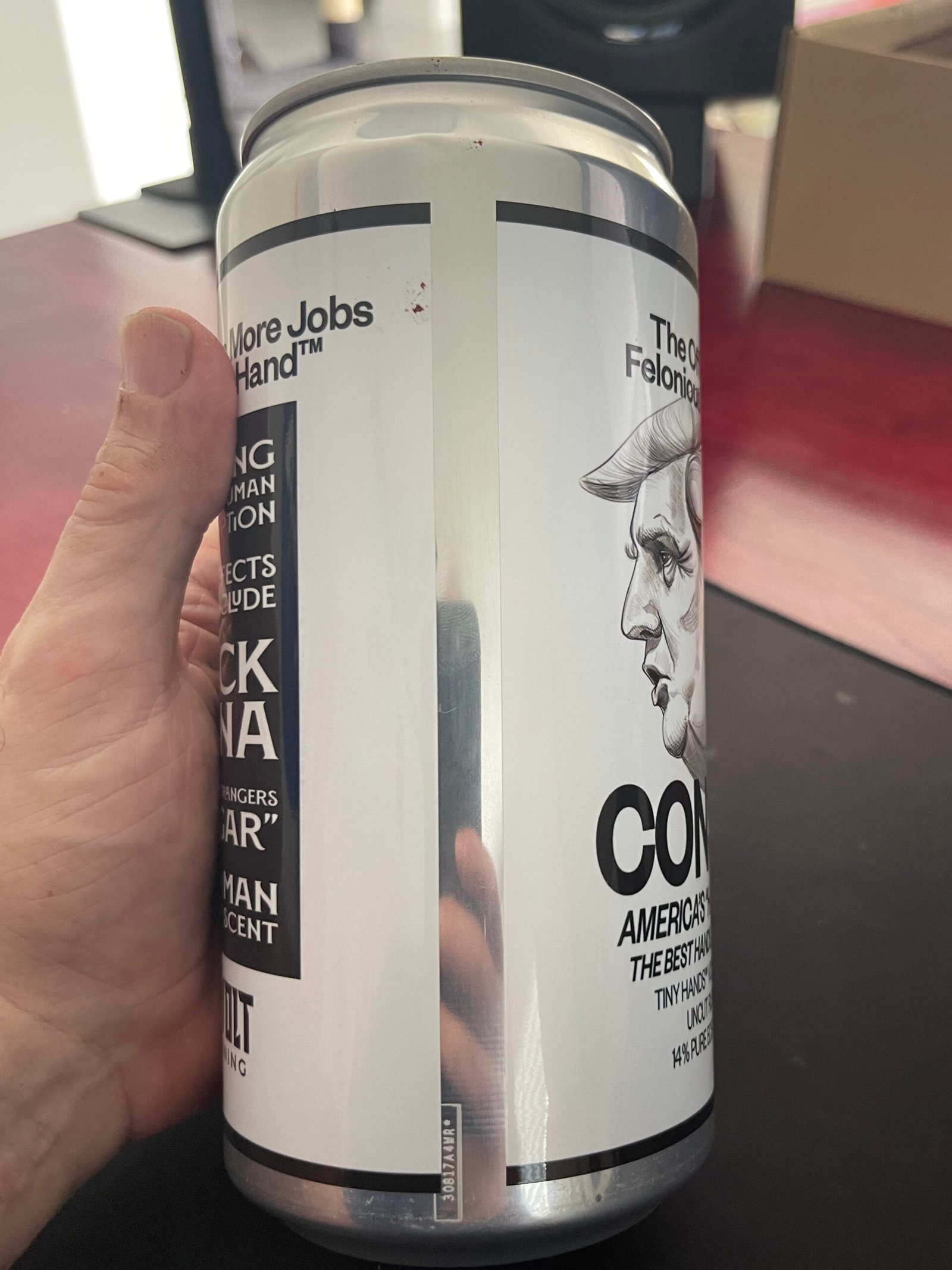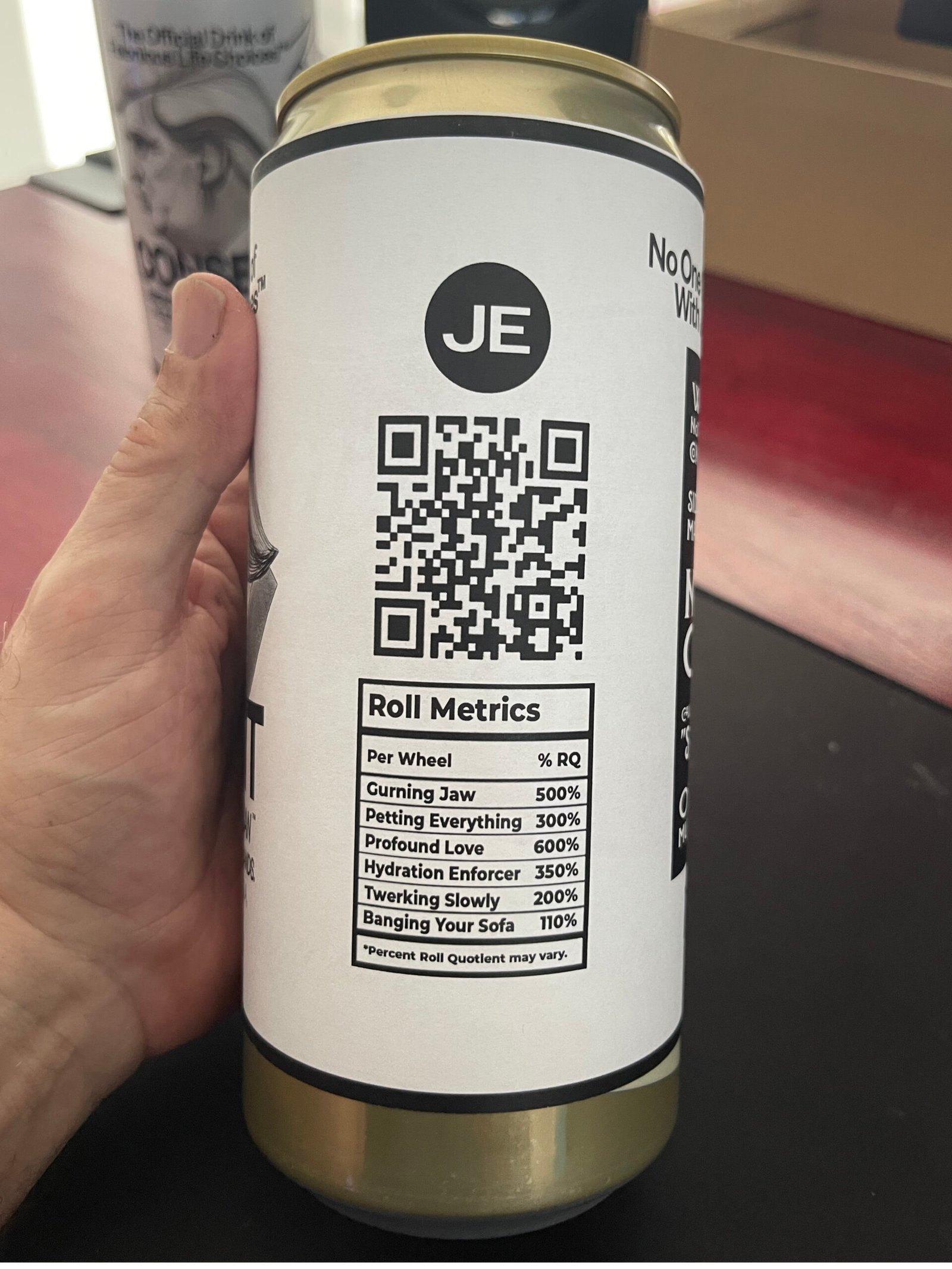 The original 32 oz demo can with paper wrapper used during design testing—included as evidentiary material, not as a separate artwork.